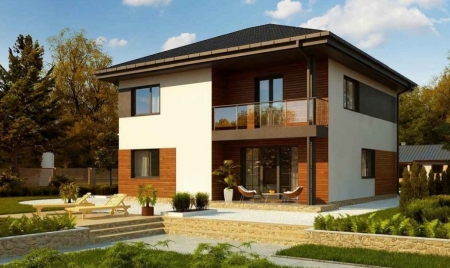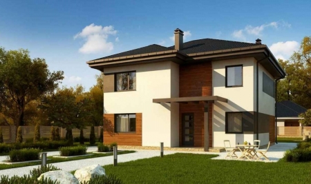 - Дом "Симпл" представлен в варианте строительства из блоков с оштукатуренным фасадом.
