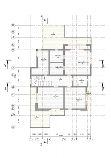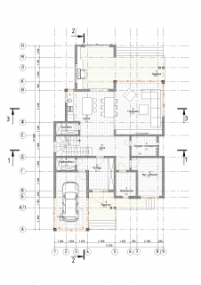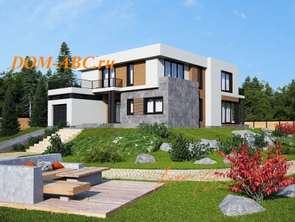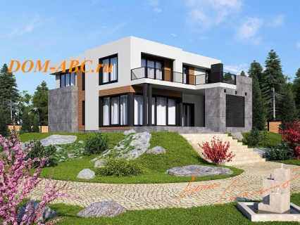 - Дом "Рока" в современном стиле с плоской крышей. Здесь есть гараж и большая терраса на первом этаже, два больших балкона на втором этаже.