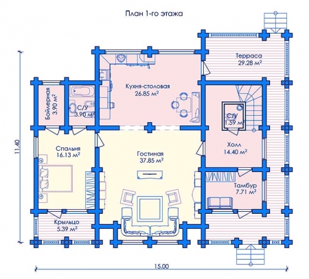 Площадь дома, м2Технология обработки бревна